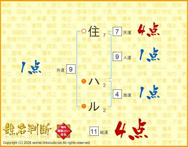 生活面を象徴する運勢です。外部から受ける影響力を表し、結婚運、家庭運や職場、環境への順応性を表します。総運から人運を引いた画数。姓や名が1文字の場合を除く。