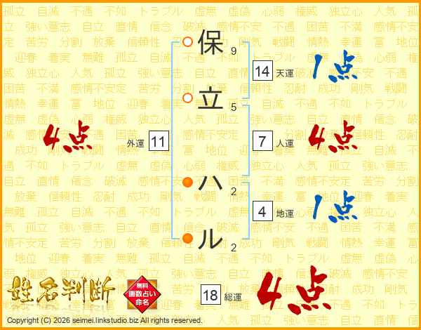 生活面を象徴する運勢です。外部から受ける影響力を表し、結婚運、家庭運や職場、環境への順応性を表します。総運から人運を引いた画数。姓や名が1文字の場合を除く。