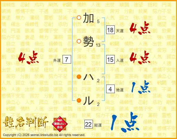 加勢ハルさんの総運は22画の1点!