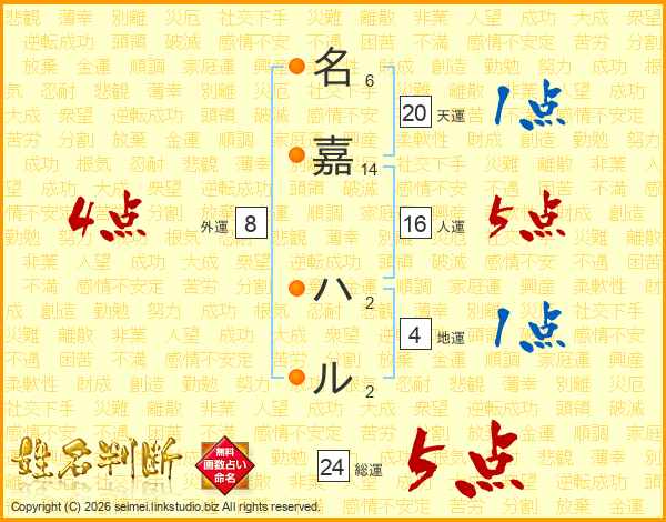 名(6画)嘉(14画) ハ(2画)ル(2画)