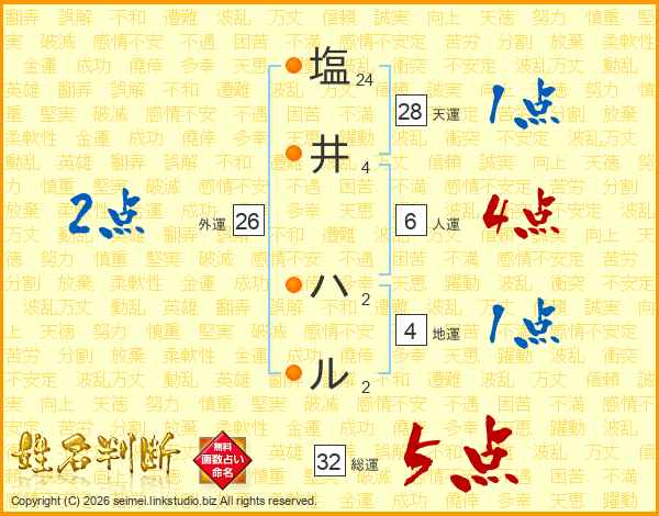 塩井ハルさんの総運は32画の5点!