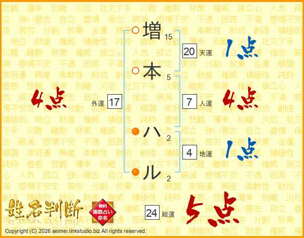 生活面を象徴する運勢です。外部から受ける影響力を表し、結婚運、家庭運や職場、環境への順応性を表します。総運から人運を引いた画数。姓や名が1文字の場合を除く。