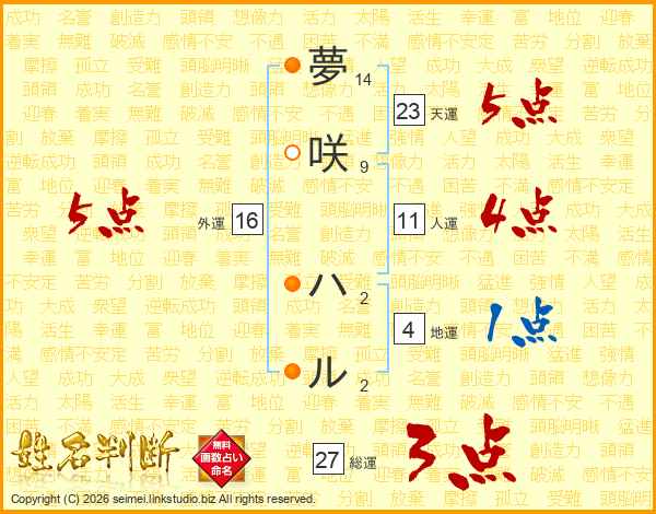 夢(14画)咲(9画) ハ(2画)ル(2画)
