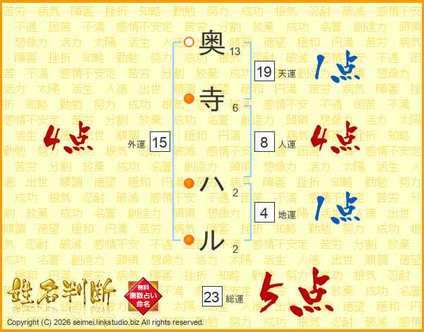 奥寺ハルさんの総運は23画の5点!