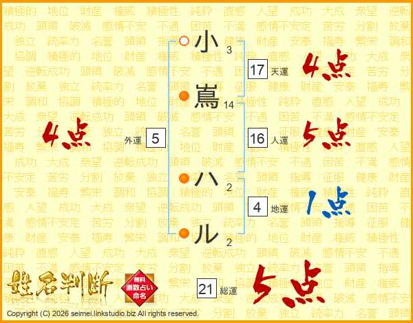 小嶌ハルさんの総運は21画の5点!