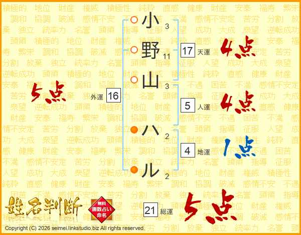小(3画)野(11画)山(3画) ハ(2画)ル(2画)