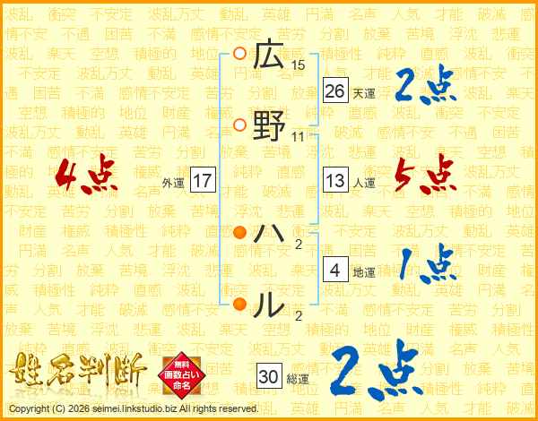 生活面を象徴する運勢です。外部から受ける影響力を表し、結婚運、家庭運や職場、環境への順応性を表します。総運から人運を引いた画数。姓や名が1文字の場合を除く。