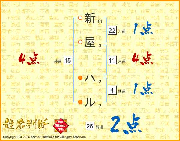 新屋ハルさんの総運は26画の2点!