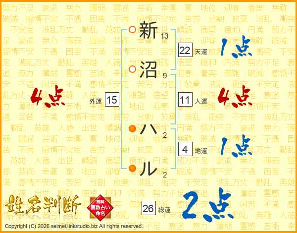 新(13画)沼(9画) ハ(2画)ル(2画)