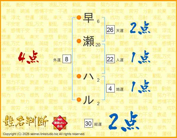 早瀬ハルさんの天運は26画の2点!