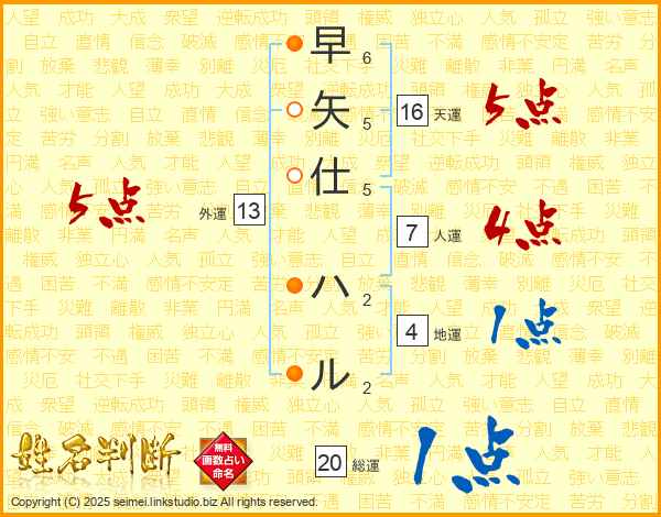 生活面を象徴する運勢です。外部から受ける影響力を表し、結婚運、家庭運や職場、環境への順応性を表します。総運から人運を引いた画数。姓や名が1文字の場合を除く。
