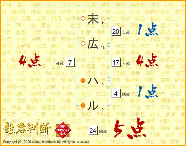 生活面を象徴する運勢です。外部から受ける影響力を表し、結婚運、家庭運や職場、環境への順応性を表します。総運から人運を引いた画数。姓や名が1文字の場合を除く。