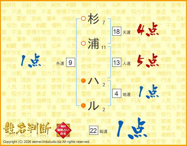 杉浦ハルさんの総運は22画の1点!