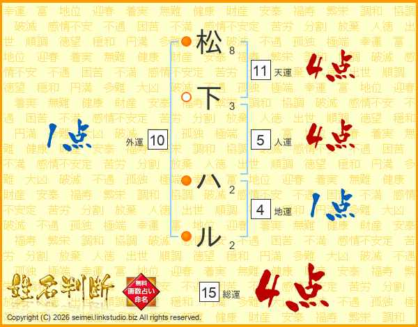 生活面を象徴する運勢です。外部から受ける影響力を表し、結婚運、家庭運や職場、環境への順応性を表します。総運から人運を引いた画数。姓や名が1文字の場合を除く。
