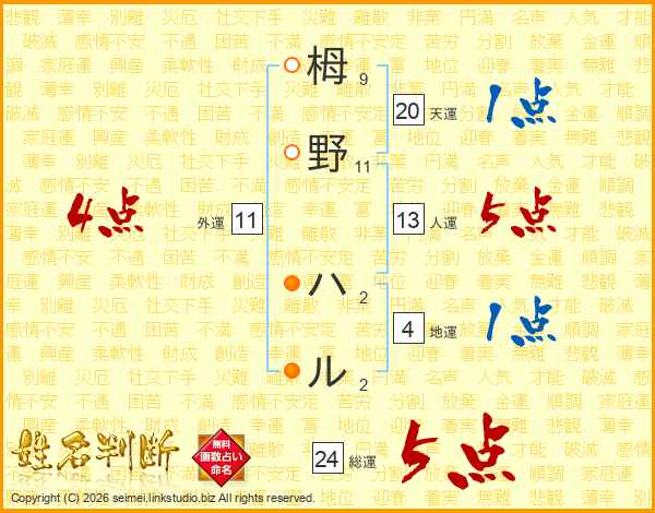 生活面を象徴する運勢です。外部から受ける影響力を表し、結婚運、家庭運や職場、環境への順応性を表します。総運から人運を引いた画数。姓や名が1文字の場合を除く。