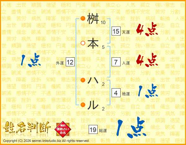 あなたの人生を表す1番重要な運勢です。生涯を通じて影響する総合運となり、主に50歳以降の晩年期に影響を及ぼします。苗字と名前の合計画数。