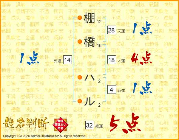 棚橋ハルさんの総運は32画の5点!