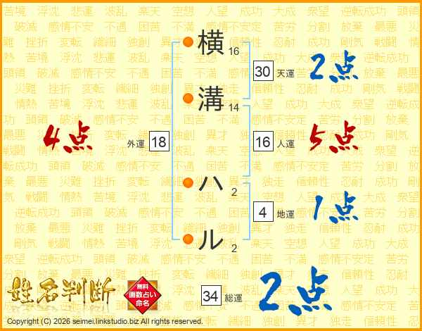 生活面を象徴する運勢です。外部から受ける影響力を表し、結婚運、家庭運や職場、環境への順応性を表します。総運から人運を引いた画数。姓や名が1文字の場合を除く。