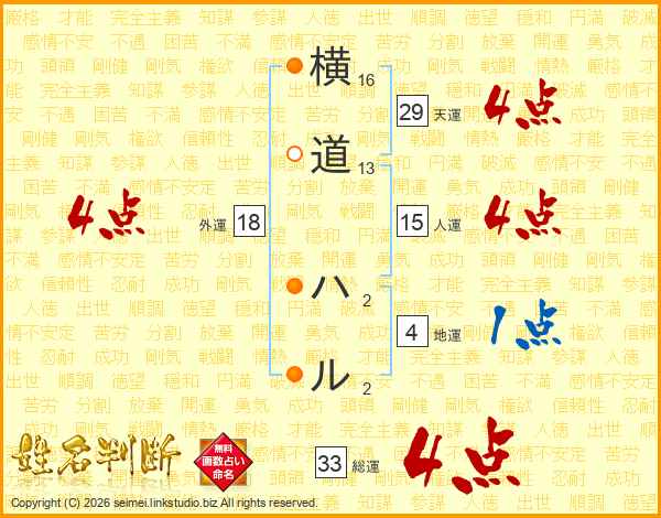生活面を象徴する運勢です。外部から受ける影響力を表し、結婚運、家庭運や職場、環境への順応性を表します。総運から人運を引いた画数。姓や名が1文字の場合を除く。