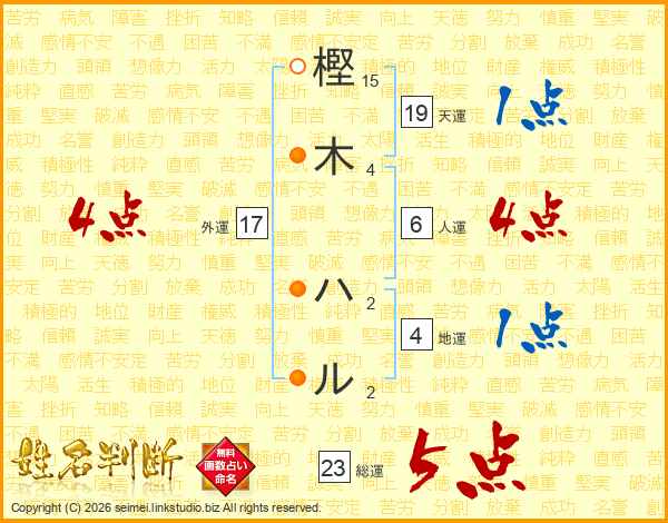 樫(15画)木(4画) ハ(2画)ル(2画)