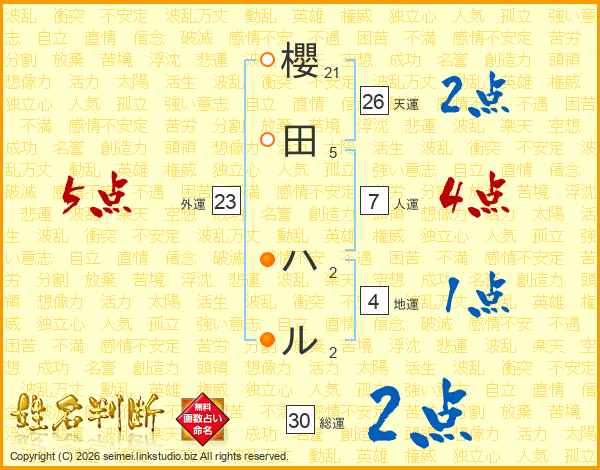 櫻田ハルさんの天運は26画の2点!