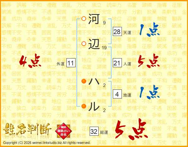 生活面を象徴する運勢です。外部から受ける影響力を表し、結婚運、家庭運や職場、環境への順応性を表します。総運から人運を引いた画数。姓や名が1文字の場合を除く。