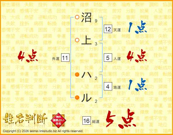 沼上ハルさんの総運は16画の5点!