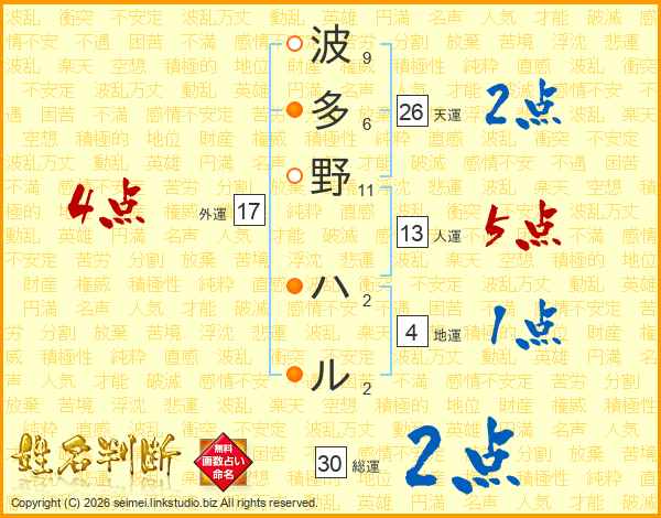 波(9画)多(6画)野(11画) ハ(2画)ル(2画)