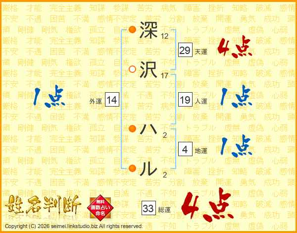 深(12画)沢(17画) ハ(2画)ル(2画)