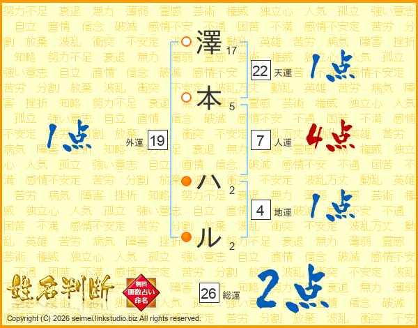澤(17画)本(5画) ハ(2画)ル(2画)