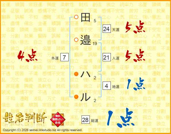 田(5画)邉(19画) ハ(2画)ル(2画)