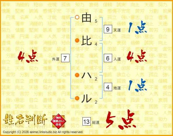 生活面を象徴する運勢です。外部から受ける影響力を表し、結婚運、家庭運や職場、環境への順応性を表します。総運から人運を引いた画数。姓や名が1文字の場合を除く。