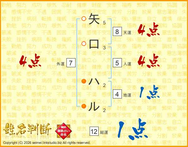 矢(5画)口(3画) ハ(2画)ル(2画)