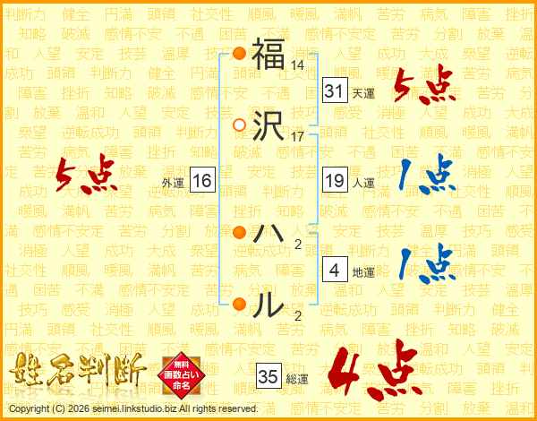福(14画)沢(17画) ハ(2画)ル(2画)