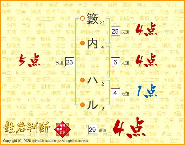 籔内ハルさんの総運は29画の4点!