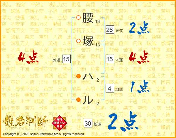 腰(13画)塚(13画) ハ(2画)ル(2画)
