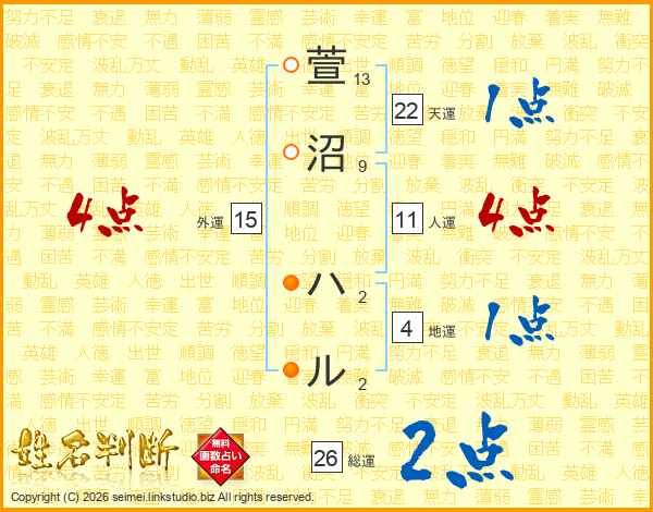 萱沼ハルさんの総運は26画の2点!