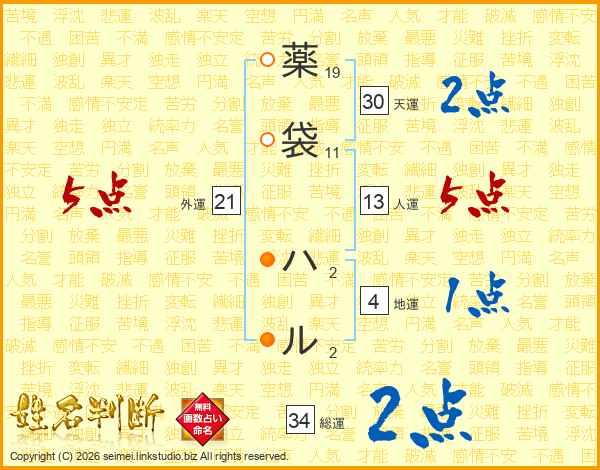 生活面を象徴する運勢です。外部から受ける影響力を表し、結婚運、家庭運や職場、環境への順応性を表します。総運から人運を引いた画数。姓や名が1文字の場合を除く。