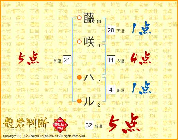 藤咲ハルさんの総運は32画の5点!
