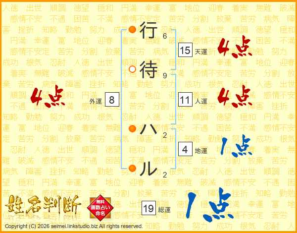 生活面を象徴する運勢です。外部から受ける影響力を表し、結婚運、家庭運や職場、環境への順応性を表します。総運から人運を引いた画数。姓や名が1文字の場合を除く。