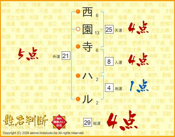 西(6画)園(13画)寺(6画) ハ(2画)ル(2画)