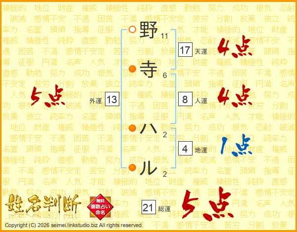 生活面を象徴する運勢です。外部から受ける影響力を表し、結婚運、家庭運や職場、環境への順応性を表します。総運から人運を引いた画数。姓や名が1文字の場合を除く。