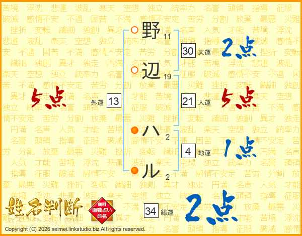 生活面を象徴する運勢です。外部から受ける影響力を表し、結婚運、家庭運や職場、環境への順応性を表します。総運から人運を引いた画数。姓や名が1文字の場合を除く。
