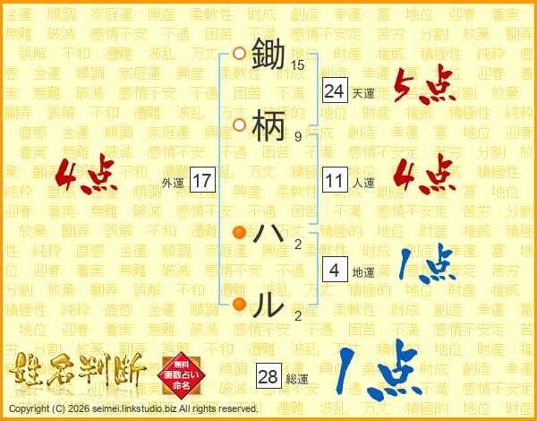 鋤(15画)柄(9画) ハ(2画)ル(2画)