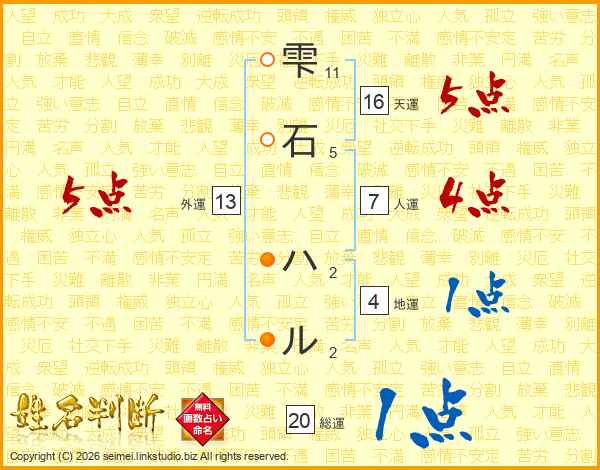 雫(11画)石(5画) ハ(2画)ル(2画)