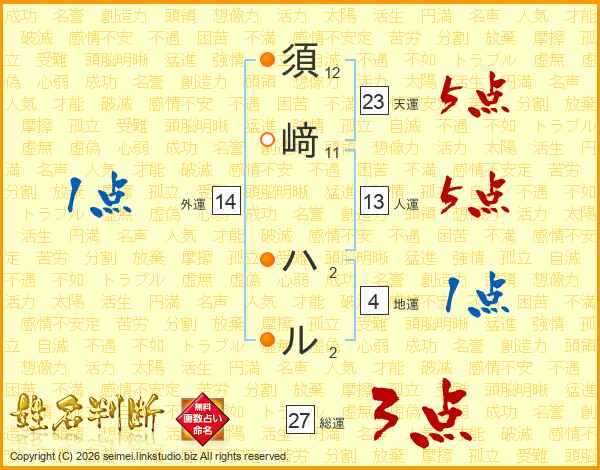 須﨑ハルさんの総運は27画の3点!