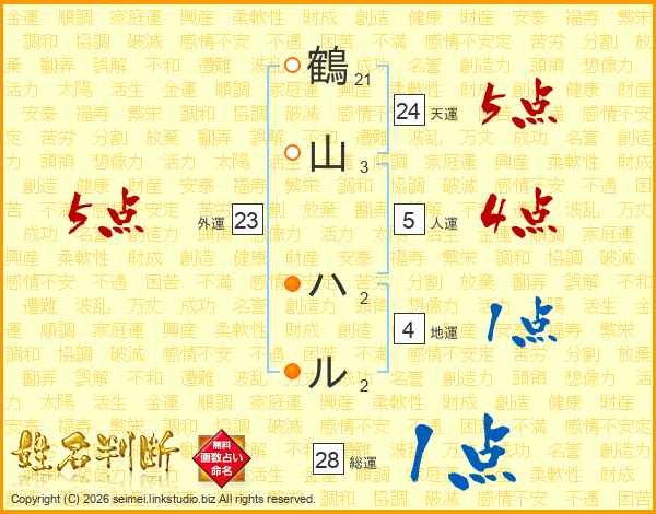鶴山ハルさんの総運は28画の1点!
