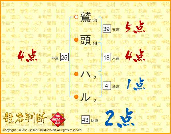 鷲頭ハルさんの総運は43画の2点!