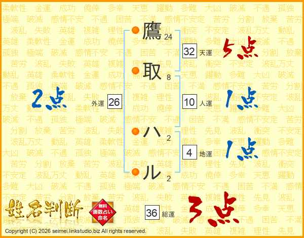鷹取ハルさんの外運は26画の2点!