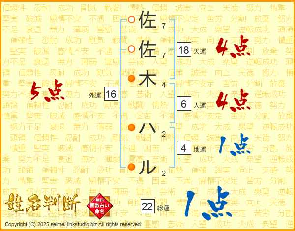 佐佐木ハルさんの外運は16画の5点!